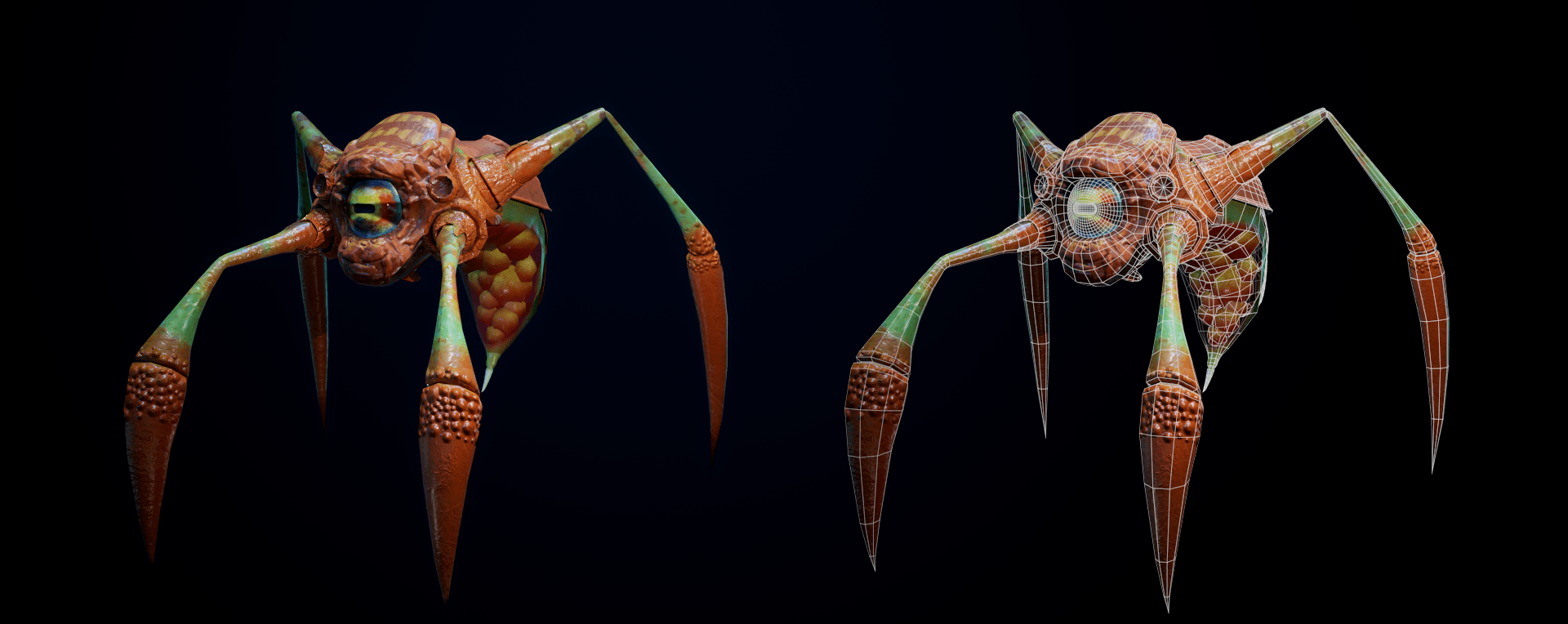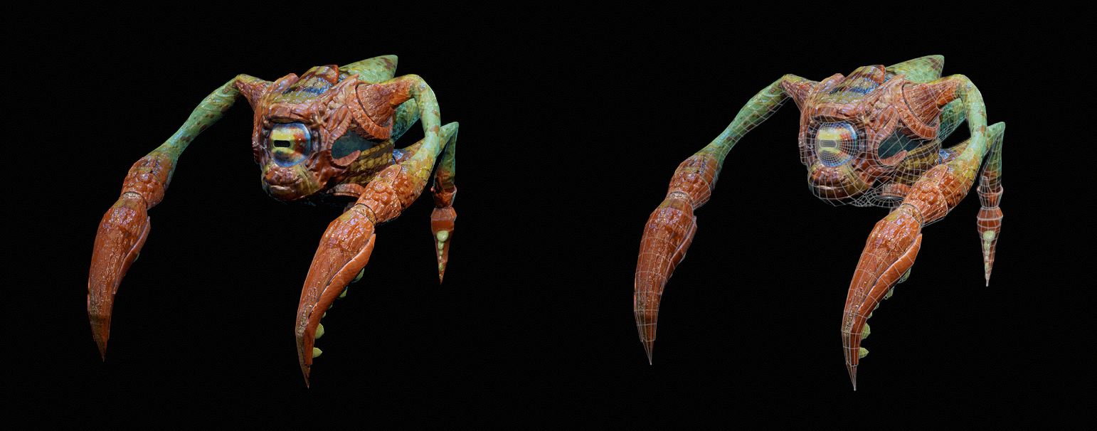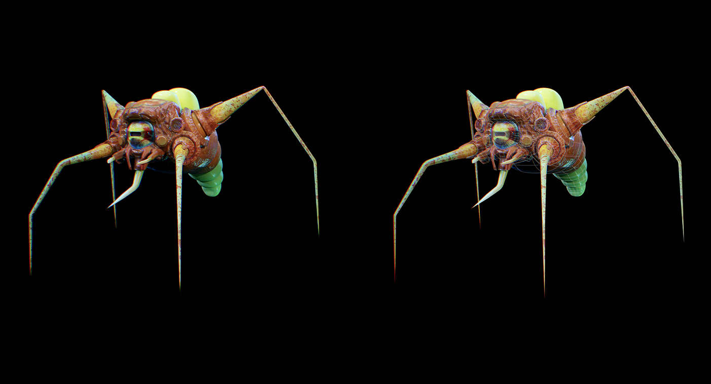 The enemies in the game have various behavior states that players can detect them in, visually identifiable through emissive patterns on their bodies and expressive shapes of their eyes. So, when producing the creatures I kept the polycount for their overall bodies rather low to account for the large number of them that will appear on screen at any given moment, while still reserving most polygons for their eyes to be emotive.