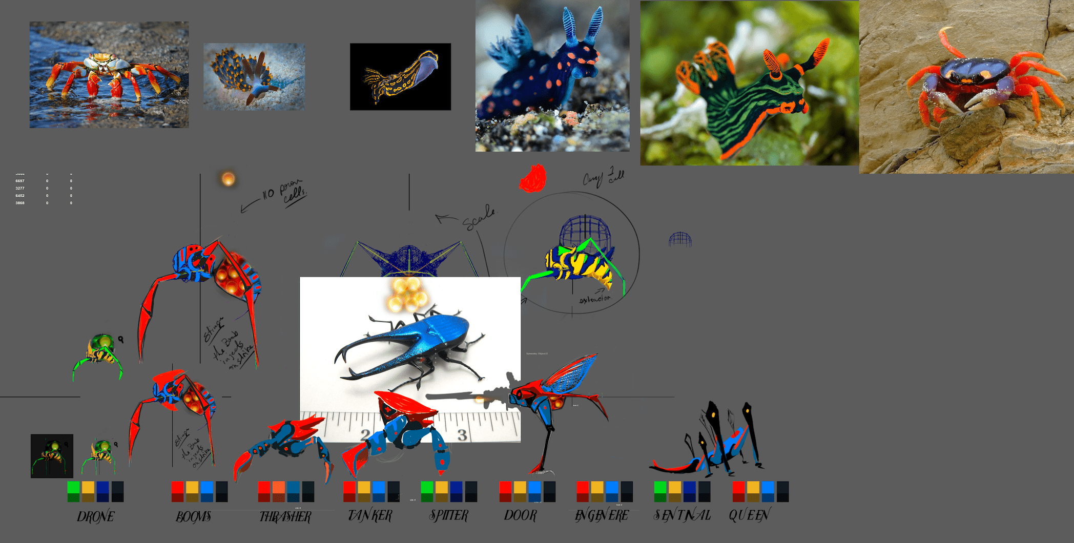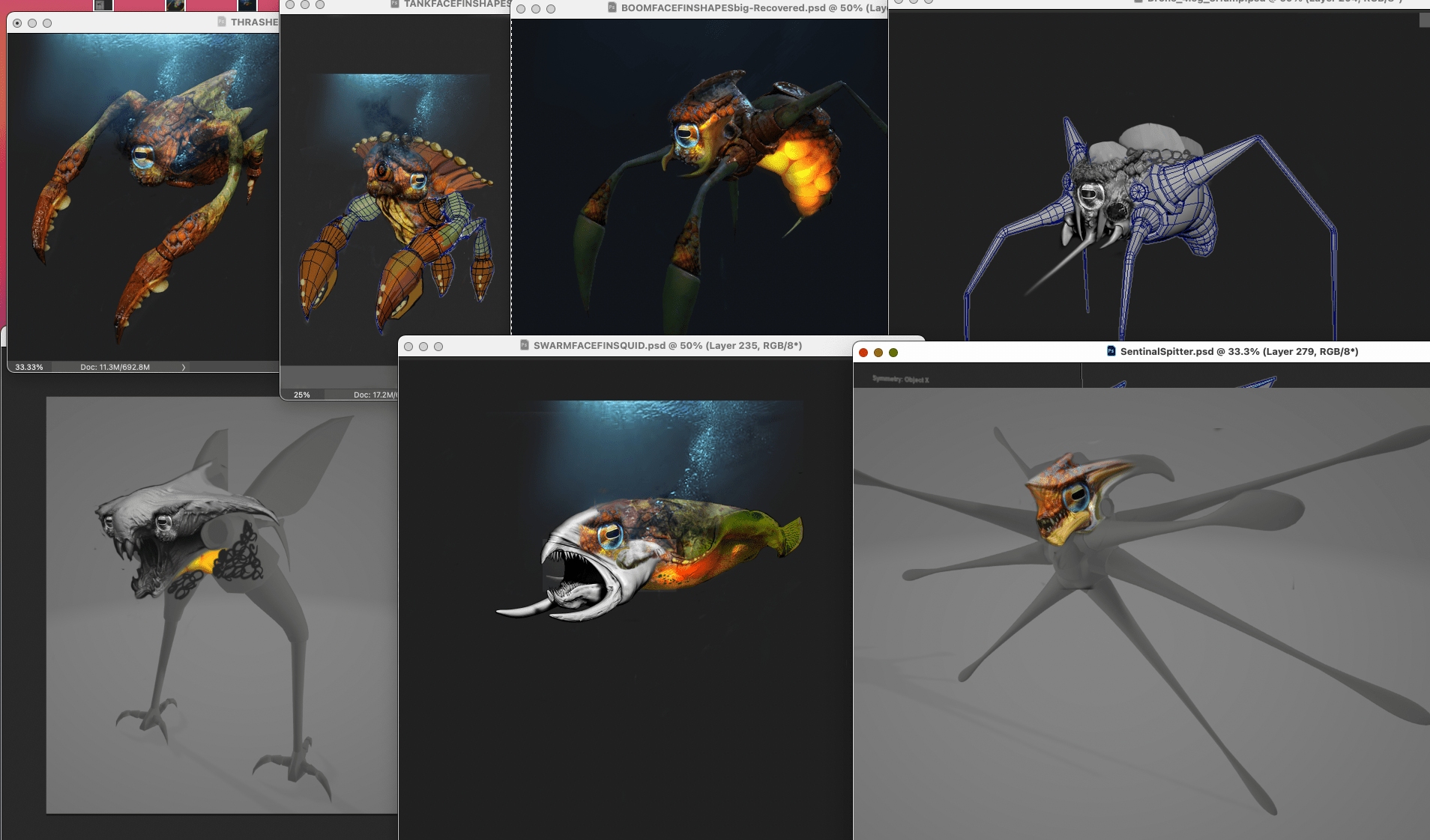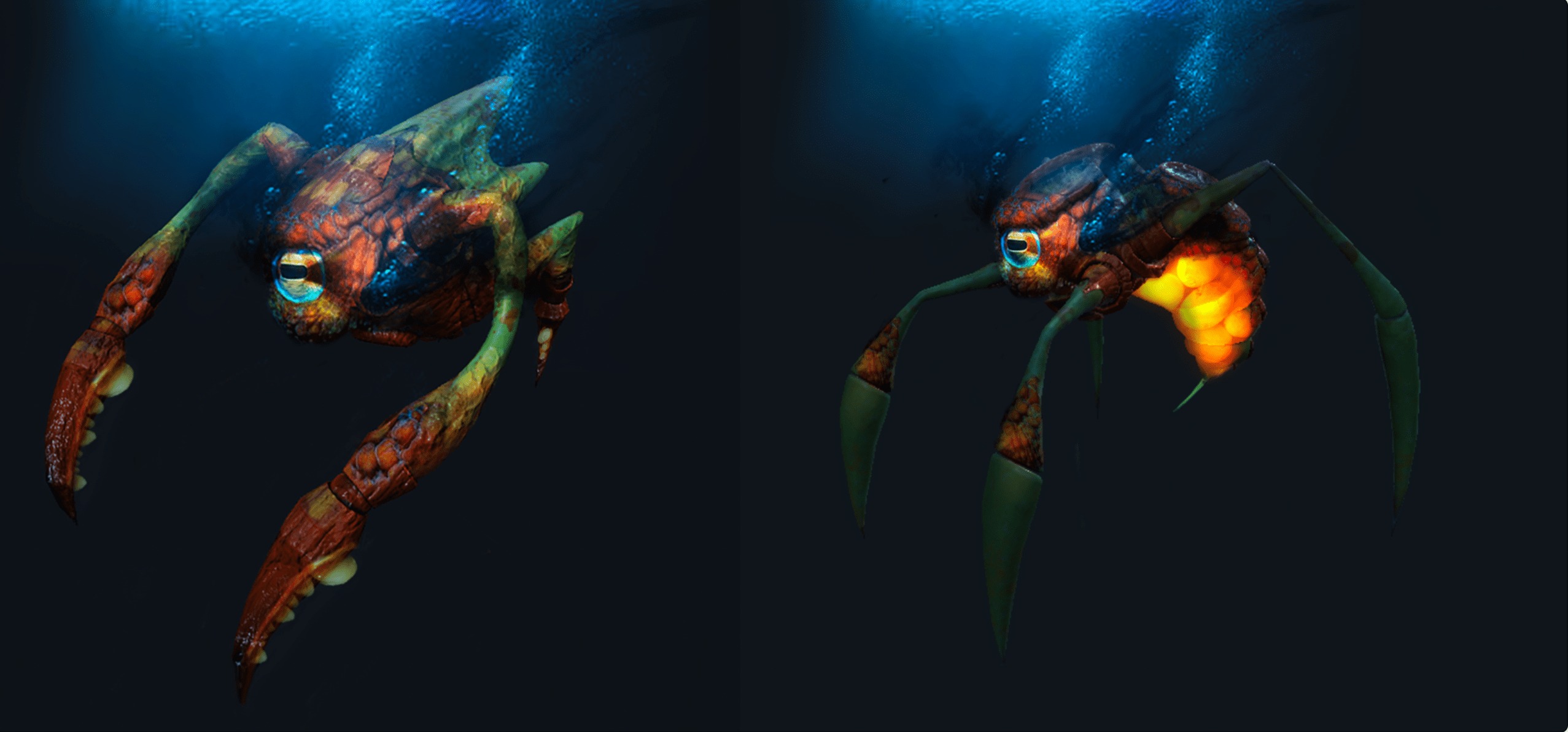 Reference was drawn from various crab species, octopi, slugs, and aquatic bottom-feeders, while trying to counter-balance that alienish look. The goal was to make the creatures appear as they came from the same biological order and are each tasked with “different roles” in their ecosystem, with dozens of them visible together at any given time.