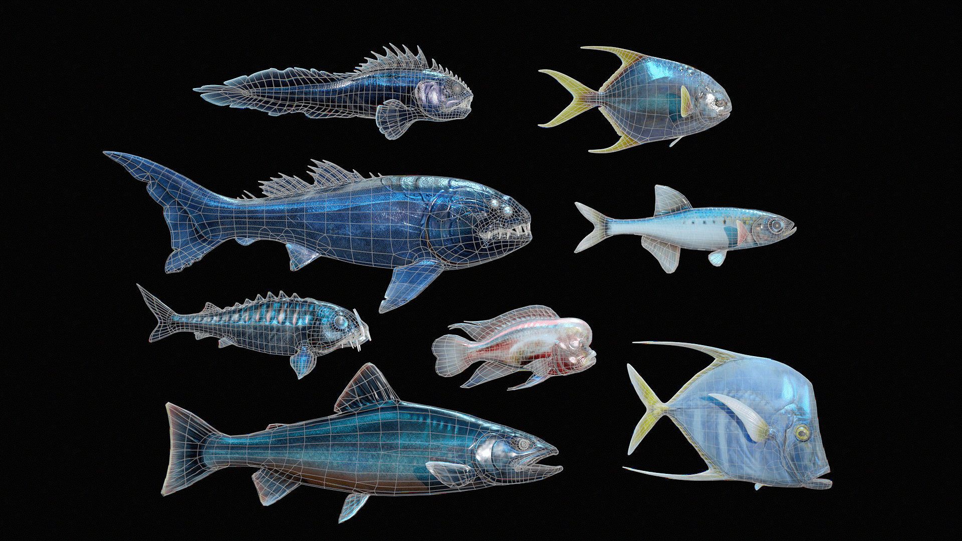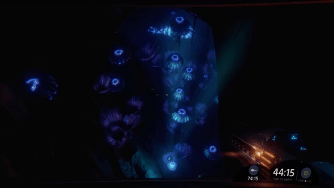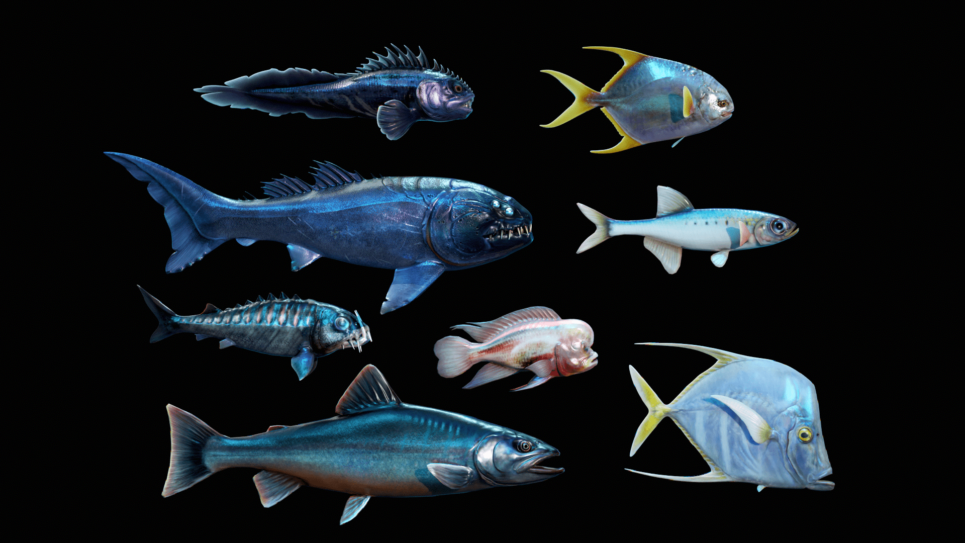 Using caustics, emissives, strong silhouetting from schools of maritime life and forms to carve out the different level themes and divide between transitional level spaces. Different chambers would emphasize certain color hues and palettes to tonally distinguish themselves from the primary cool blues and deep blacks. Lighting and particle effects played an enormous role in parsing important gameplay moments and reveals for the player, breadcrumbing them to trail through the level’s critical/golden paths and retain ludonarrative flow.
